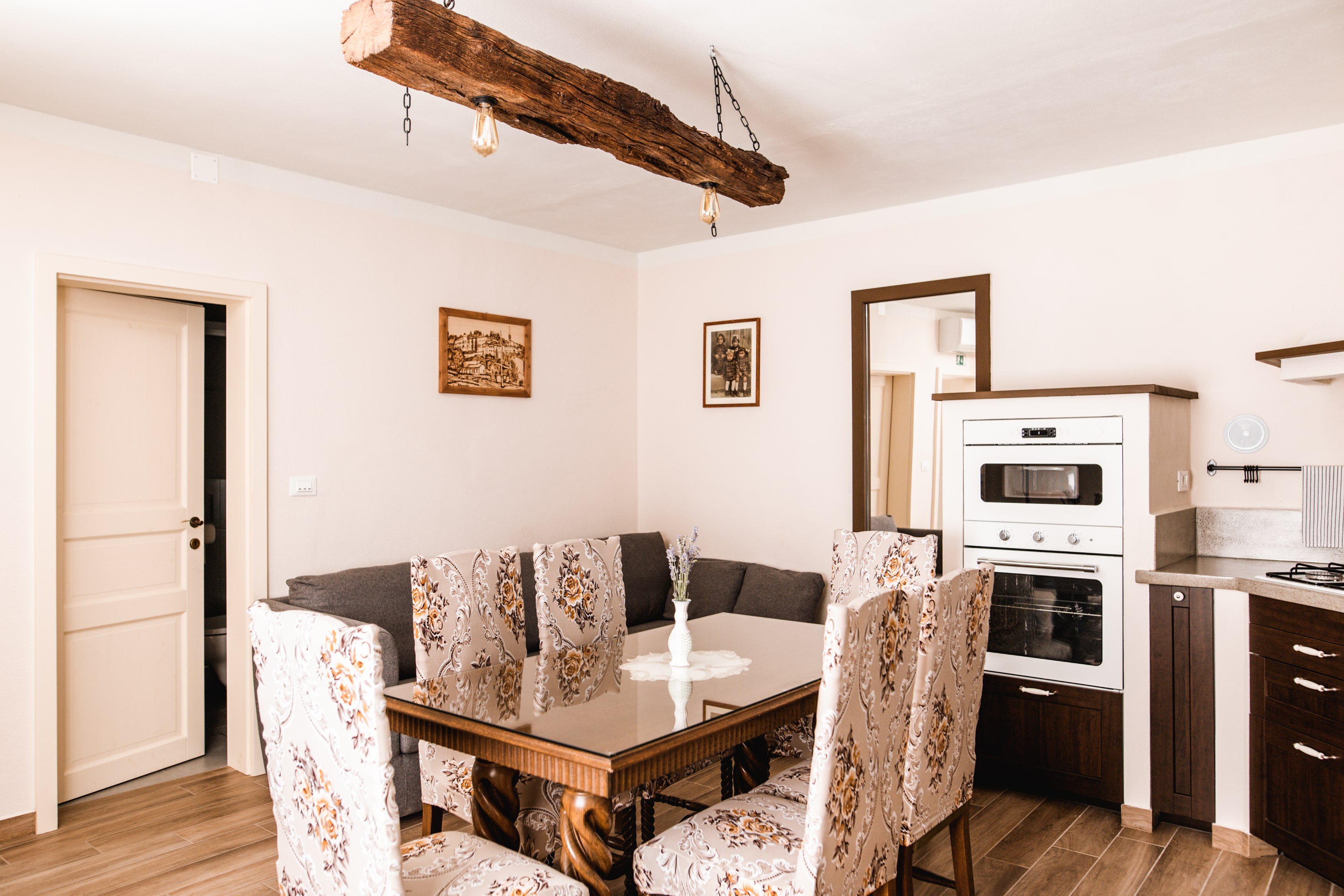 - kuhinja (indukcijska kuhalna plošča, mikrovalovna pečica, pomivalni stroj, hladilnik z zamrzovalnikom, kuhalnik za vodo, kavni avtomat, jedilna miza)